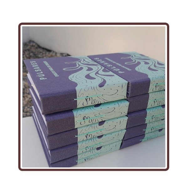Púlsares es un libro poético donde las palabras e imágenes son Silencio y Voz simultáneamente. Escrito introspectivo que se funde con los grabados convirtiéndose en uno. La técnica utilizada predominantemente como método de estampación es el gofrado, que al ser textura y rastro crea claroscuros fascinantes para la lectura. El libro está compuesto por dos cuerpos laterales con propuesta de lectura horizontal y otra vertical. En el centro entrelazado por hilo, contiene un cuadernillo interior con información formal y biografías.
